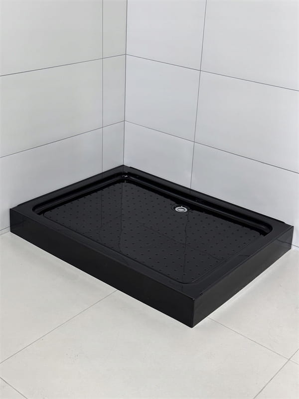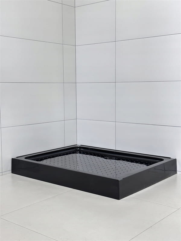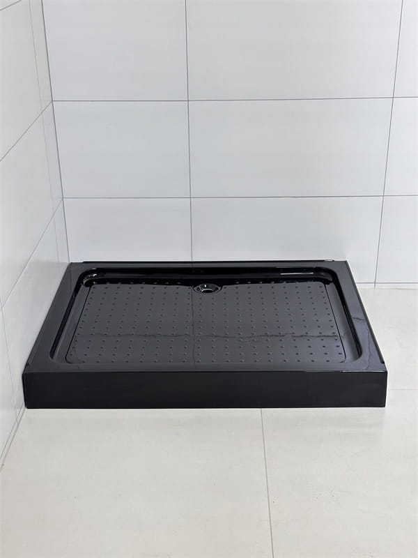 Czarny brodzik akrylowy o wysokości 14 cm posiada wzmacniany spód z włóknem i metalowym stelażem. Chropowata powierzchnia z wypustkami minimalizuje ryzyko poślizgu, a montaż na posadzce pozwala na stabilne i estetyczne osadzenie.